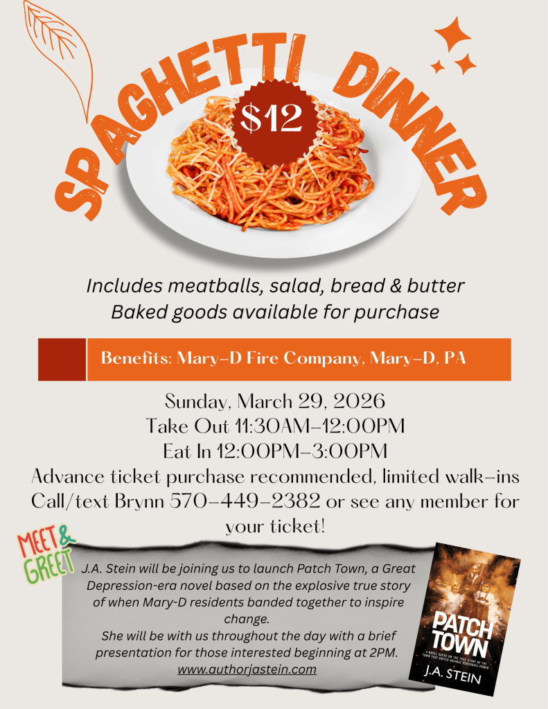 Join me in the little town of Mary D, Pennsylvania, where my family has lived for over three generations. On March 29, I will be there from 11:30-3 signing Patch Town, the story of a coal mining town during the Great Depression. At 2pm I will give a brief presentation, complete with some family photos of Mary D back in the day. The residents of Mary D in 1938 were concerned about change. Interestingly enough, ninety years later, the landscape around Mary D is continuing to change, in part due to reclamation efforts fixing what the residents from 1938 were worried about. It is a historical story, but I think it is also one that will echo with the modern reader in this ever-rapid era of change. The best thing about this launch party is that the Mary D Fire Company is allowing me to join in during their Spaghetti Dinner fundraiser, so if you come hungry you are actually benefitting a great cause!